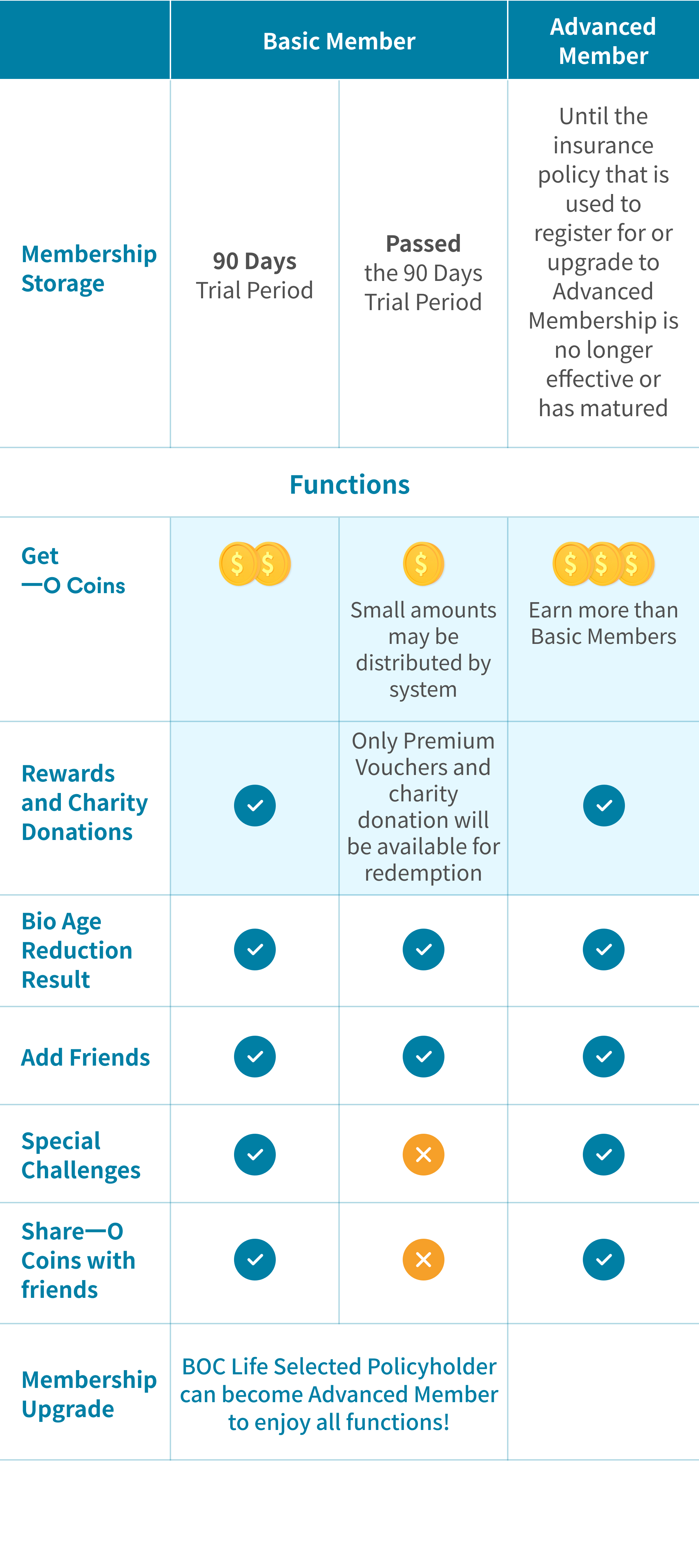 Members can enjoy below listed functions of the “Live Young Rewards App” according to the member type: